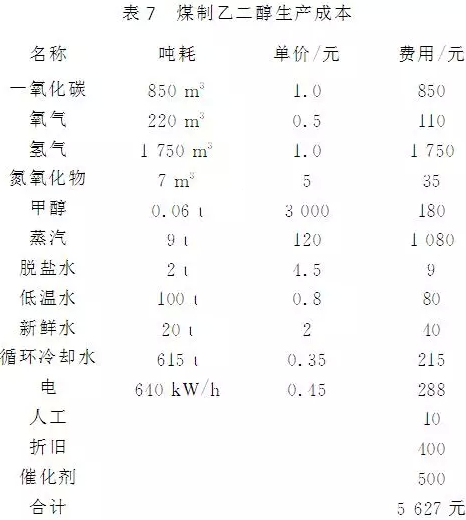 按原料煤市场价格580元/t、动力煤550元/t估算,主要原料H2与CO价格均约1.0元/立方,由此,可算出煤制乙二醇生产成本(见表7)。